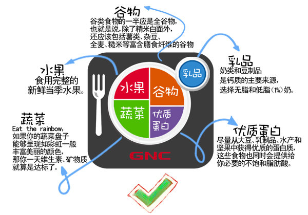 身体的每一个分子都来自于你所吃的食物和水。吃优质的食物有助于获得健康、活力以及抵御疾病的最大潜能。主食中的一半是全谷物,让水果、蔬菜的量和肉类以及主食相当。从鱼类或者坚果、种子类食物中获得必需脂肪酸。