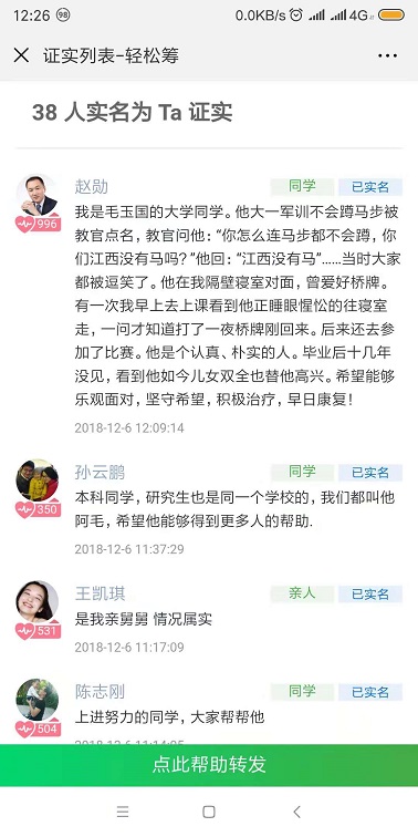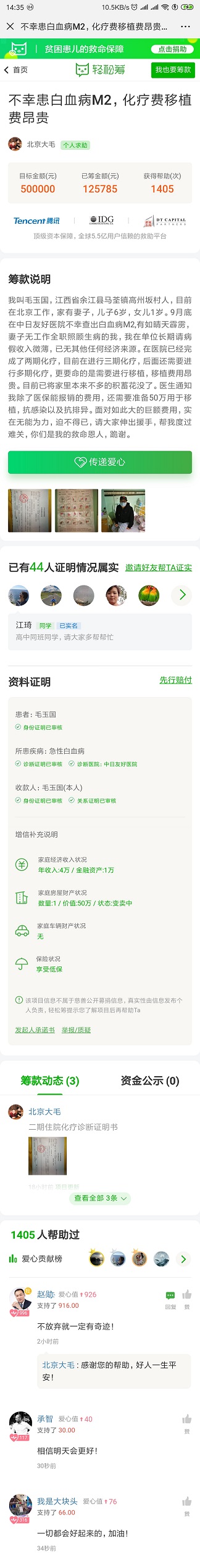 听说毛玉国得了白血病,从8月份到现在一直在和病魔作斗争,但是化疗需要的资金远超他能所受上线,无奈之下发起了众筹。得知情况我写了以下文字: