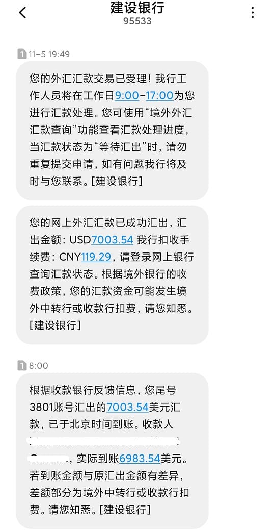 比如招行是人民币100元的手续费+人民币150元邮电费,并不会扣汇款的资金。但建行却是在收取了手续费人民币20元和邮电费人民币80元之后,还会扣汇款资金,(比如我就被收取了美金24.48元)不知道走的什么渠道。