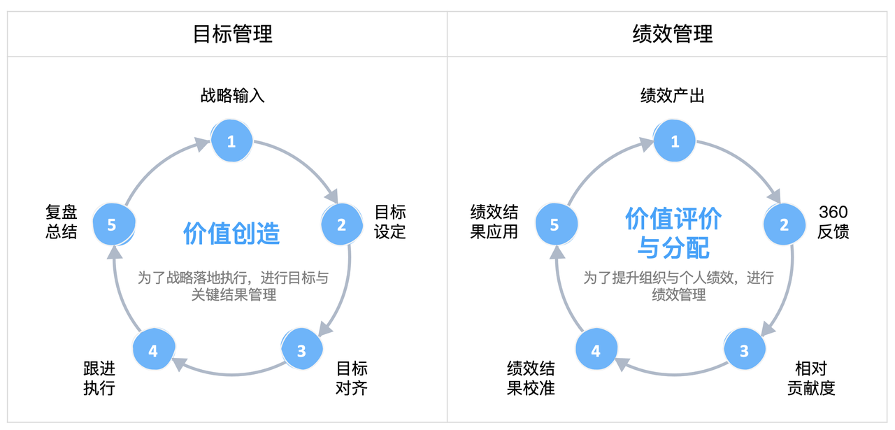 本质上,KPI 与 OKR 都是目标管理工具。 目标管理的目的,是为了让组织里的人朝着一个方向前进。只不过,目标会有不同的表现形式。在 KPI 这里,目标等于可衡量的指标(Indicators);在 OKR 这里,目标就是目标(Objectives),并需要关键结果(Key Results)支撑。在实际运用中,KPI 的达成率往往与绩效评估直接挂钩,OKR 的达成率应当与绩效评估脱钩。为何 OKR 的达成率应当与绩效评估脱钩?OKR 是目标管理,关注的是价值创造;而绩效评估关注的是价值评价,也就是看员工的实际产出。一位员工的 OKR 达成率高,不一定产出就高,可能是目标定低了,反之亦然。因此,OKR 的达成率应当与绩效评估脱钩。