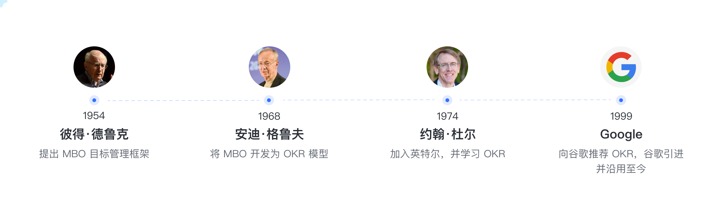 1954年,彼得·德鲁克(Peter F. Drucker)在《管理的实践》一书中首次提出 目标管理(Management by Objectives,简称 MBO)的概念。德鲁克预见到,现代企业中的专业人员数量将会急剧增加。他担心,管理者会依据员工的专业水准而非对企业做出的实质贡献来评估绩效。如此一来,员工将专注于个人成就而非企业的目标与愿景。为了解决这种可能的困境,德鲁克提出了 MBO 的概念。在《管理的实践》中,他这样介绍道: “从‘大老板’到工厂领班或高级职员,每位管理者都需要有明确的目标,而这些目标应当总是源于企业的整体目标。” 德鲁克的目标管理理念对美国企业的高管们产生了重要影响,他们纷纷开始在企业内实践 MBO。然而,实践的形式却是五花八门,其中不少都偏离了德鲁克的初衷。原本是企业上下共同参与的目标管理,最后演变成了自上而下的目标强制分配。由于很少有企业能通过 MBO 获益,一时间 MBO 遭受了大量质疑和批评。但是一个叫安迪·格鲁夫(Andy Grove)的人却意识到了 MBO 背后的价值。格鲁夫是硅谷的一名传奇人物,这位英特尔(Intel)的前 CEO 带领着企业成功占据了全球微处理器领域的霸主地位,也正是他把 MBO 引入了英特尔。格鲁夫对原有的目标管理模型做出了调整,并构建起我们今天所熟知的“目标与关键结果法” (Objective and Key Results,简称 OKR)。格鲁夫认为, 一个成功的目标管理系统需要回答以下两个问题:“我想去哪儿”和“我如何调整节奏以确保我正在往那儿去”。 这两个问题,正是 OKR 的两个核心,即目标(Objective)和关键结果(Key Results)。与德鲁克的 MBO 模型相比,格鲁夫的 OKR 在许多方面都做出了调整,例如目标制定的个数、目标设置的频率以及目标的难度等。更重要的是, 格鲁夫打破了众多企业自上而下的官僚体制,强调自上而下与自下而上相结合,这对 OKR 的成功实施起到了重要作用。 故事讲到这里,依然没有结束。格鲁夫创建了 OKR,但是把 OKR 进一步发扬光大的却另有其人,他就是约翰·杜尔(John Doerr)。杜尔是风险投资公司凯鹏华盈(Kleiner Perkins Caufield and Byers)的合伙人,他曾在英特尔担任工程师并在那里学习 OKR。加入了凯鹏华盈后,他把 OKR 理念传播给了数十家企业。1999 年,杜尔带着一份礼物来到了他刚投资不久的谷歌(Google)的总部,这份礼物正是 OKR。他用 90 分钟向包括谷歌创始人拉里·佩奇(Larry Page)和谢尔盖·布林(Sergey Brin)在内的 30 多人介绍了 OKR。自那以后,谷歌开始全面推广 OKR,直到今天,OKR 依然是谷歌不可或缺的一部分。